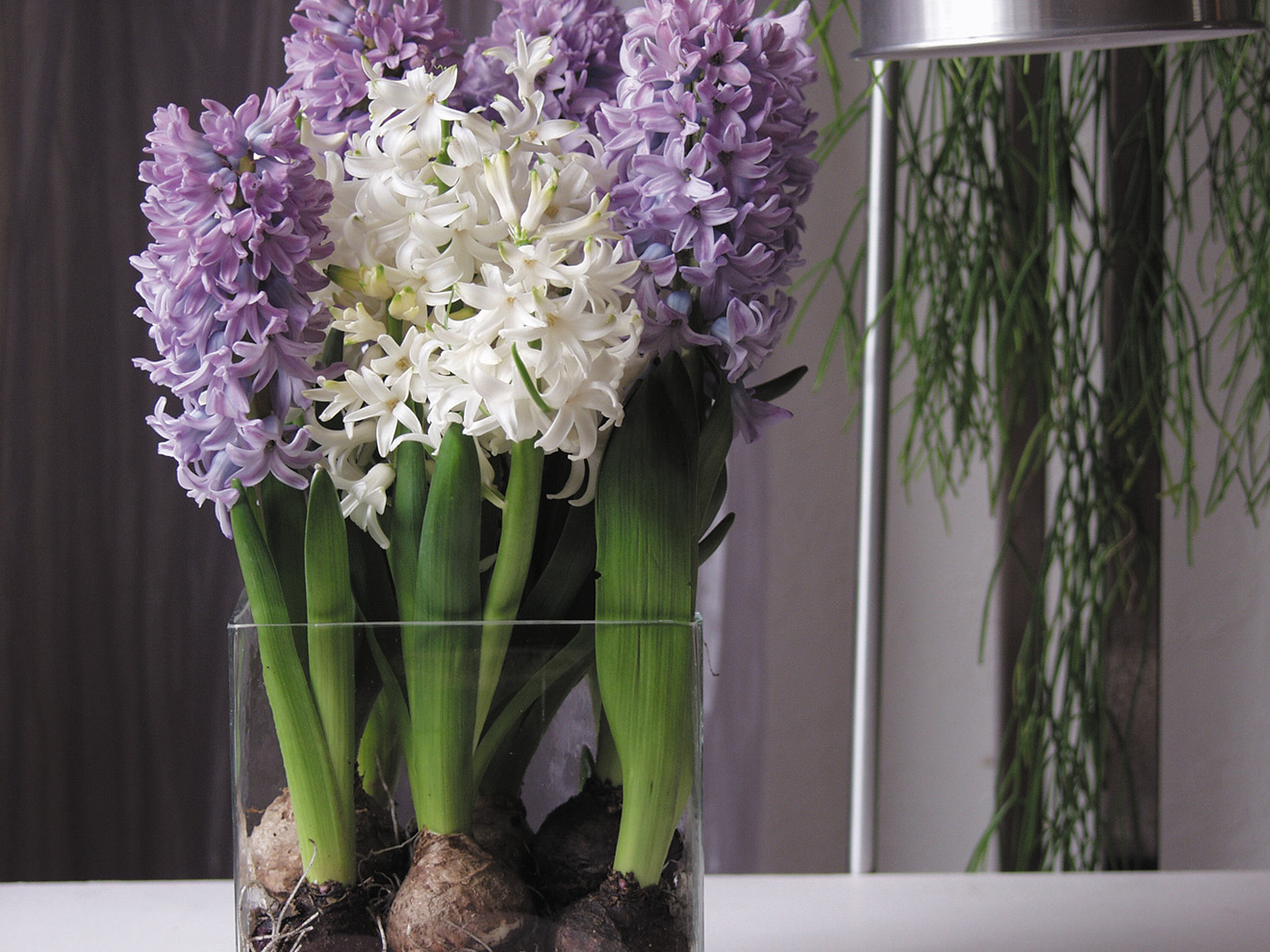 Potted bulbs can cope well with sunlight. But if a bulb is placed directly behind the glass in a spot with a lot of sunlight, the flower will grow especially fast. We therefore recommend finding a cooler spot in the home.