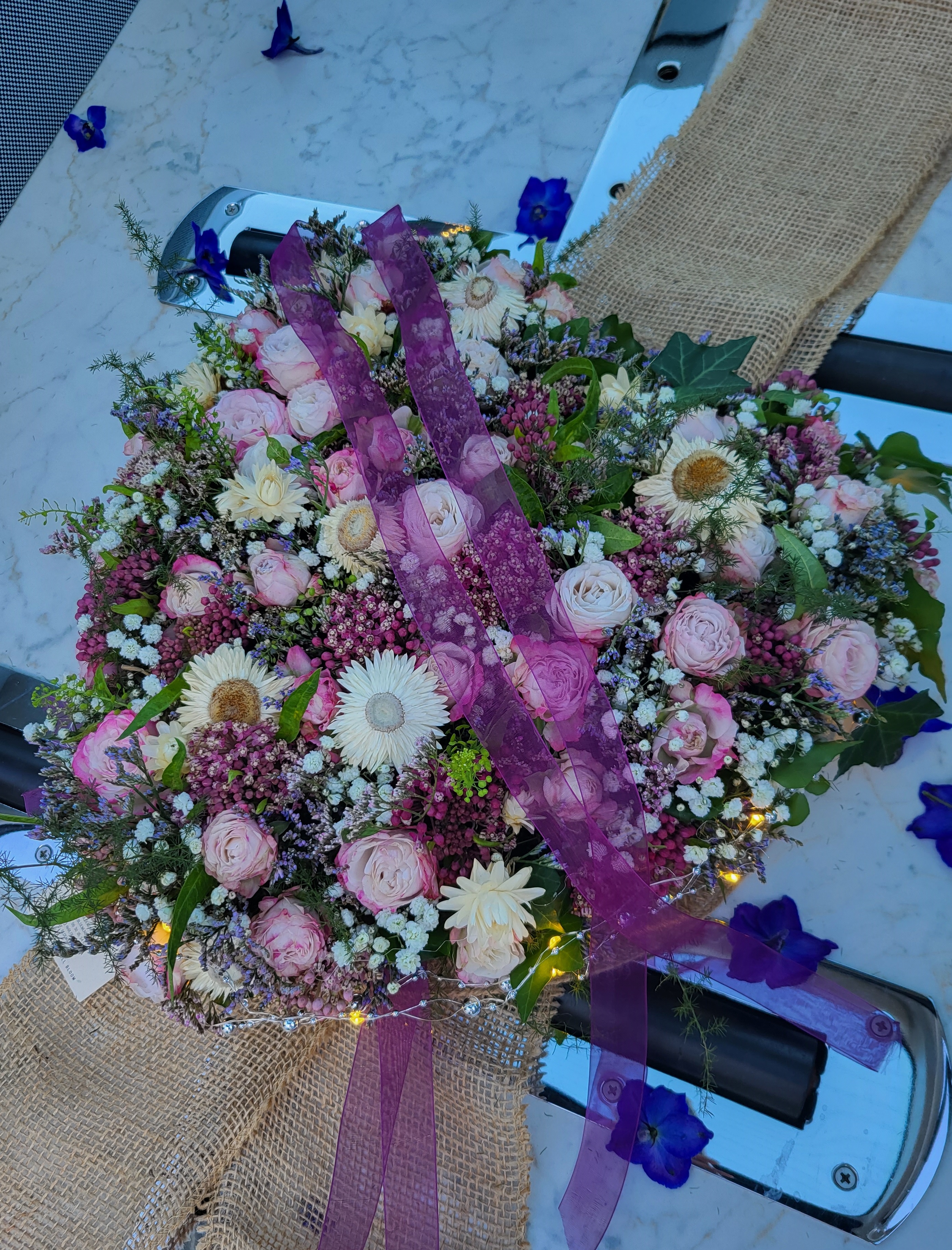 Another beautiful way to say goodbye is with a farewell boat. This is a boat that is beautifully made up with flowers and let out into nature via the water. Appropriate to this is to work with materials that are biodegradable, such as bio oasis." A wreath is also a favourite of Leonie's. "You also see these days that the wreath is hung so that the floral arrangement is in the shape of a moon. In the centre of the wreath then hangs a string with a pearl attached".